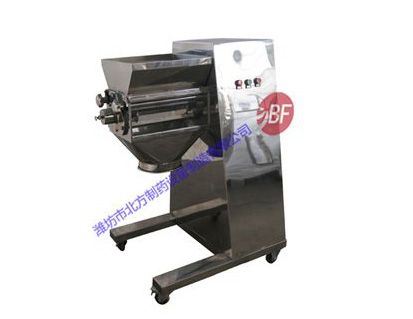 搖擺式顆粒機制得的顆粒一般粒徑分布均勻,有利于濕粒均勻干燥。它的主要特點為旋轉為旋轉滾筒的轉速可以調節,篩網裝卸容易,還可適當調節其松緊。機械傳動系統全部密封在機體內,并附有調節系統,提高了機件的壽命。但由于成粒過程是由滾筒直接壓迫篩網而成粒的,物料對篩網的擠壓力的摩擦力均較大。使用金屬篩網時易產生金屬污染處方,而尼龍篩網由于容易破損需經常更換,在使用時應加以注意。