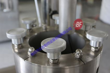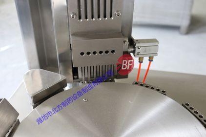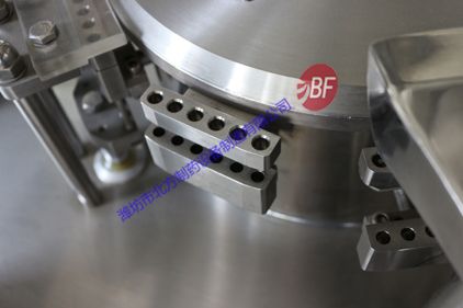 2、采用加大工作臺面,保證了該機運行的穩定性(工作臺面比其他廠家工作臺面大90mm)。所有與藥物接觸部分均采用不銹鋼,與藥粉接觸部分零部件(1)、計量盤SUS316L;(2)、充填桿SUS316L;(3)、上、下模塊SUS316L;(4)、料斗SUS304;(5)、刮粉器、刮粉刀SUS304;(6)、密封圈等SUS316L。