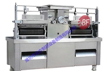 將混合、煉制均勻的藥料膏坨送入制丸機(jī)料斗中,通過(guò)翻板翻轉(zhuǎn)擠壓,在推進(jìn)器的作用下,藥條由兩側(cè)料嘴擠出。當(dāng)藥條到達(dá)長(zhǎng)度時(shí),由自動(dòng)切刀切斷,再由分配器以每秒一次的速度將藥條送入搓輥。輥刀的位置和輸送帶松緊可分別通過(guò)微調(diào)裝置進(jìn)行調(diào)整,改變丸粒大小和重量可通過(guò)更換相應(yīng)規(guī)格的制丸刀輥實(shí)現(xiàn),操作方便。