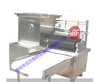 將混合、煉制均勻的藥料膏坨送入制丸機(jī)料斗中,通過翻板翻轉(zhuǎn)擠壓,在推進(jìn)器的作用下,藥條由兩側(cè)料嘴擠出。當(dāng)藥條到達(dá)一定長(zhǎng)度時(shí),由自動(dòng)切刀切斷,再由分配器以每秒一次的速度將藥條送入搓滾。滾刀的位置和輸送帶松緊可分別通過微調(diào)裝置進(jìn)行調(diào)整,改變丸粒大小和重量可通過更換制丸刀輥實(shí)現(xiàn),操作方便。