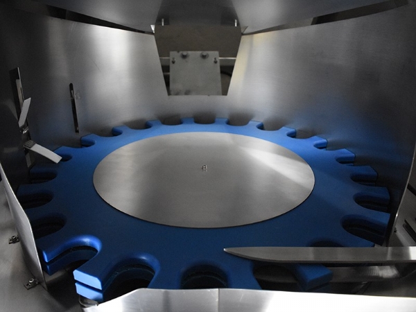電機通過齒輪傳動帶動理瓶花盤工作。瓶斗內的瓶子通過理瓶花盤的半圓槽將瓶子從理瓶花盤的下方轉動到理瓶盤上方,半圓槽內的瓶子經過理瓶機構的翻瓶板理瓶,自動將瓶口朝下瓶底朝上的瓶子進行翻轉完成理瓶。